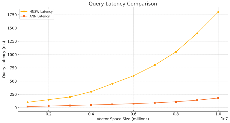 This graph compares the query latency of HNSW and the new ANN index algorithm across different vector space sizes. Explanation: The ANN index algorithm consistently demonstrates lower latency compared to HNSW, with a more pronounced difference in larger vector spaces.
