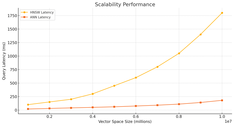 Graph 2: Scalability Performance:This graph illustrates the performance of both algorithms as the number of vectors increases from 1M to 10M. Explanation: The ANN index algorithm maintains stable performance across increasing dataset sizes, whereas HNSW shows a decline in efficiency.